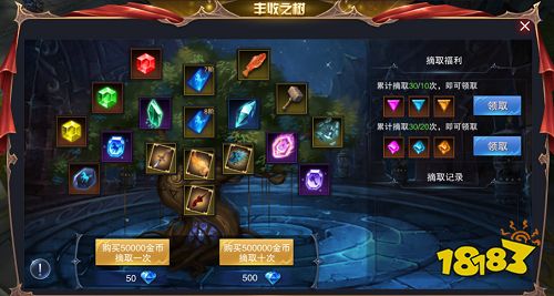 活动规则:活动期间,购买金币即可参与丰收之树,摘取必获得高级宝石、稀有翅膀、锻造石等珍贵道具,累积摘取次数还能领取宝石福利。