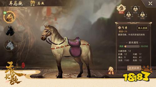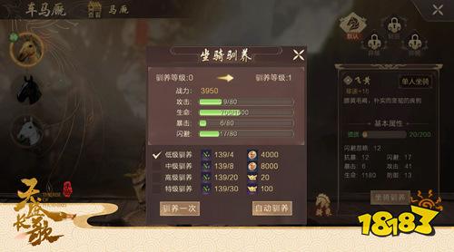 坐骑驯养是玩家加强马匹基本属性的方式,驯养分初级、中级、高级、特级四个等级,不同等级的驯养需要消耗相应的“草料”、铜钱和元宝。驯养后的坐骑不仅可以提升自身星级,还能帮助玩家大幅提升移速和战力,达到一定战力值便可到坐骑榜中与众多玩家一决高下啦!