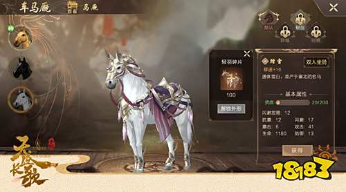 《天盛长歌》手游里的坐骑分两种类型:单人坐骑和双人坐骑。其中,飞黄和乌骓属单人坐骑,飞黄膘黄毛褐,是一匹朴实而坚韧的良驹,玩家可通过主线剧情或在马场中击败呼卓铁骑获得;乌骓马通体似黑缎,唯有四个蹄子白的赛雪,玩家需到马场中击败呼卓铁骑校尉才可获得;踏雪属双人坐骑,拥有它可开启双人骑坐功能,是游戏中的一大亮点。它通体雪白,是产于塞北的名马,玩家通过购买VIP礼包即可获得。