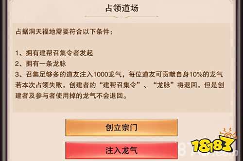 3、召集足够多的道友注入1000龙气,每位道友可贡献自身10%的龙气。若本次占领失败,创建者的“建帮召集令”、“龙脉”将退回,但是创建者及参与者使用掉的龙气不会退回。