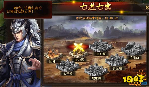 蜀传活动也有许多题材,比如这次的就是赵云七进七出的题材活动,活动是限时的,一定要关注好活动的时间。活动内容为七个战场,依次为团林、辍刀区、当阳桥、太子桥、娘娘井、长坂坡、汉京口,打完第一个战场获得胜利之后即可进行下一个战场,每进入一个战场。