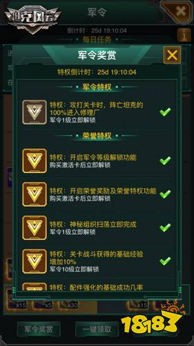 千万不要小看了军令特权,激活军令特权意味着你将获得更有利的条件。当《坦克风云》军令特权提升到一定等级后将会解锁N种特权,包括攻打关卡时,阵亡坦克100%进入修理厂;神秘组织扫荡立即完成;关卡战斗获得的基础经验+10%;配件强化基础成功几率+10%;午间/晚间补给可获得双倍能量;攻打世界叛军时不会产生战损这六种特权。从策略规划来看,是不是对你的战斗十分有利呢?