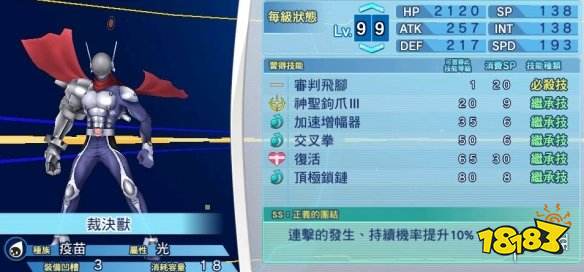 审判飞脚:对敌方单体发动威力130的无属性物理攻击,并有5%的几率使自己的ATK提升50%。