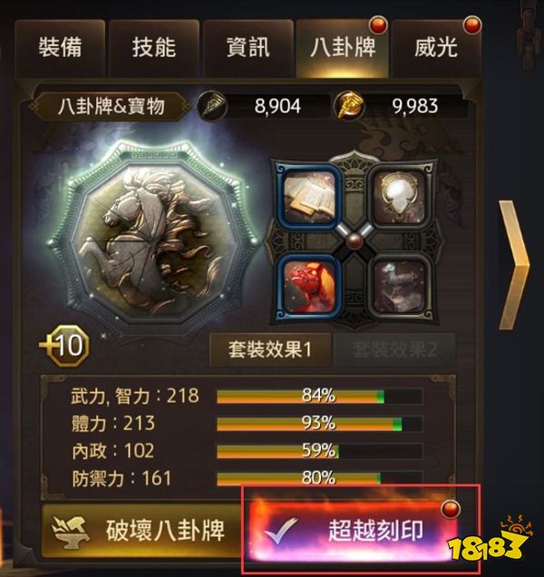 超越刻印八卦牌1、八卦牌等级达到10级,可进行超越刻印。