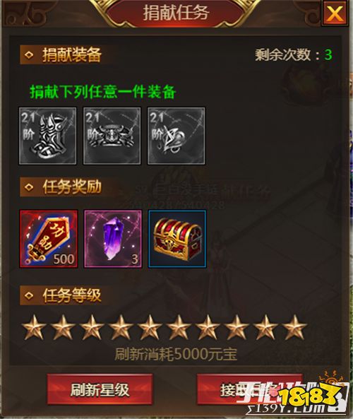 1.玩家每天可以完成3次捐献任务,通过捐献指定装备完成任务