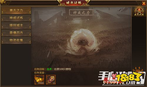 1.共有5种威名任务,意志之力、神威试炼、膜拜城主、震慑四方、物资收集