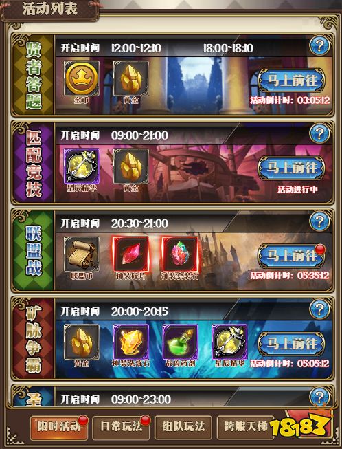 限时活动分为贤者答题,匹配竞技联盟战,矿脉争霸及圣痕试炼五部分。要注意的是,这五个活动每日限时开启,大家要留意时间不要错过啦!
