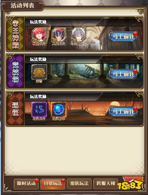日常玩法分为帝王神殿,竞技场以及远征三个部分。帝王神殿就是我们与帝王缔结链接,使帝王助我们一臂之力的神圣场所了!是非是欧,抽上几个十连就清清楚楚啦!