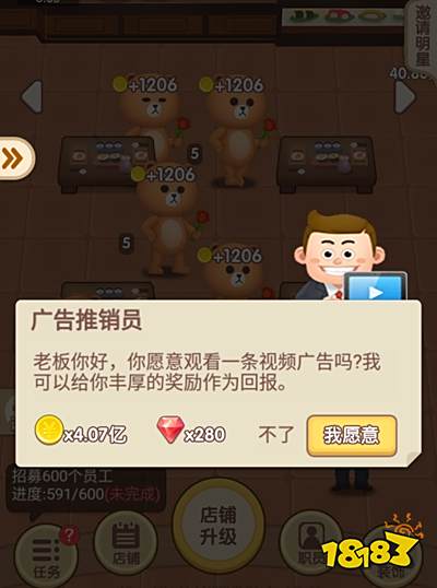偶尔会遇到一些广告推销员,要求玩家观看一条视频广告,玩家统一观看后会获得金币和钻石的奖励