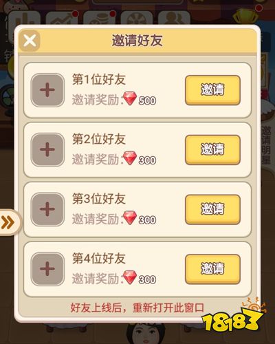 邀请好友一起玩天天铺子,好友上线后会获得钻石奖励。