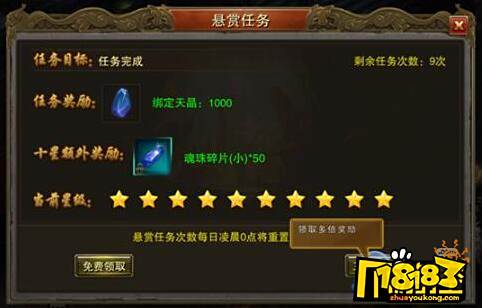 每日可以完成10次悬赏任务,获得海量天晶和魂珠碎片奖励。
