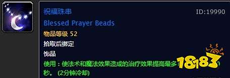 1、祝福珠串:蓝色品质饰品,使用效果使法术和魔法效果造成的治疗效果最多提高190点,持续20秒(2分钟冷却)。