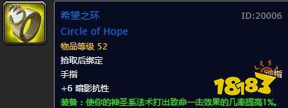 3、希望之环:蓝色品质戒指,+6暗影抗性,装备效果使你的神圣系法术打出致命一击的几率提高1。