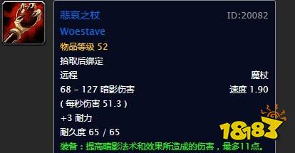 2、悲哀之杖:蓝色品质远程魔杖,68-127暗影伤害,攻速1.90,+3耐力,装备效果提高暗影法术和效果所造成的伤害,最多11点。