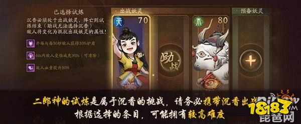 本次联动活动引入全新副本机制“试炼副本”,在试炼中,降妖师必须使用沉香为出阵妖灵,并为其搭配阵容及灯魂天赋,选择代表不同负面效果的试炼条目后进行试炼挑战。试炼条目有多个种类及等级,条目组合成的试炼等级越高,副本难度越大,通关后的奖励也越丰厚。