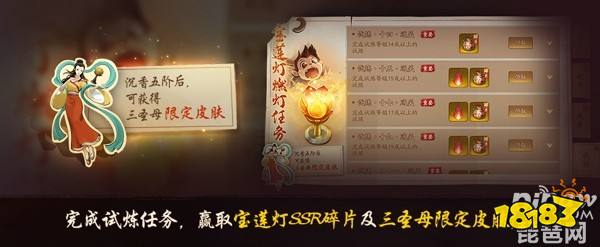 除了超难的试炼外,降妖师们还需帮助沉香完成一个个燃灯任务,强大实力,为回归异界做好准备。燃灯任务分为成长、战斗、收集和试炼四大类,完成试炼任务可获得灯魂、宝莲灯SSR妖灵碎片、幽都神藏等珍贵奖励。