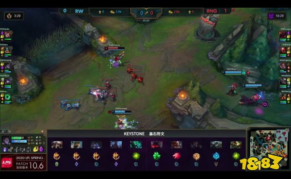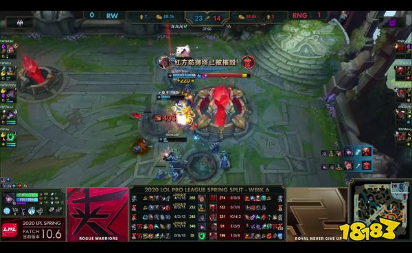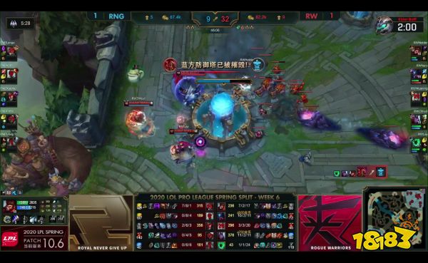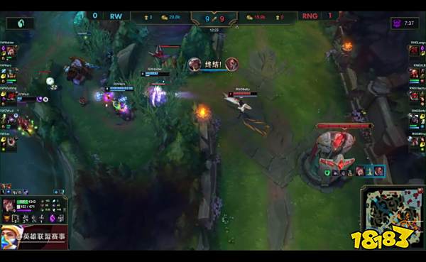 [18:30] 腕豪野区开团佐伊,被佐伊逃脱,一番团战拉扯后RNG打出零换二,召唤峡谷先锋推掉了RW中路高地塔。