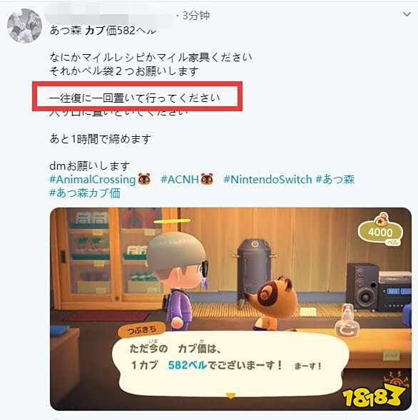 另外推特有各种时间行者直接调到周日,供玩家上岛买大头菜。你看到“カブ90ベルです”的字样,就是专门买大头菜的岛。