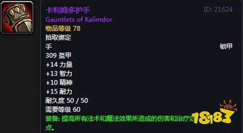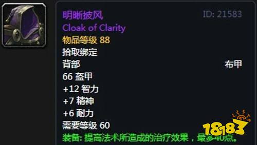 基础属性:271护甲,+18智力,+13耐力,+11精神,+10暗影抗性,装备效果 使你的法术造成爆击的几率提高1%,提高法术所造成的治疗效果,最多26点。