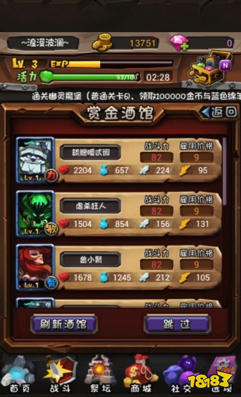酒馆里可以雇佣英雄,我们可以看他们的参数值挑选。