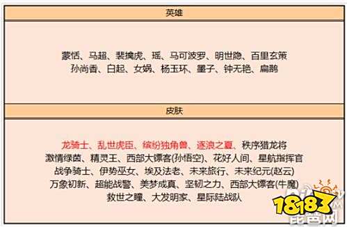墨子-龙骑士(288碎片)、张飞-乱世虎臣(78碎片)、小乔-缤纷独角兽(88碎片)、李元芳-逐浪之夏(88碎片)