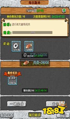 2、做完新手任务,就开始重复地刷怪换地图升级,每开一个地图获得的经验和道具数量都会增加。游戏右上角会显示每小时获得的石币、肉食和经验。