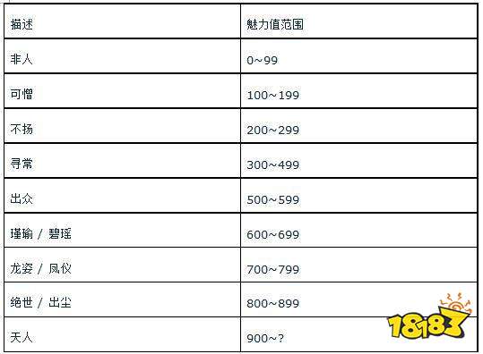4) 按照评分所在区间,魅力值会在对应的区间内随机产生。最高档范围是500-900.也即[出众]~[天人]。其中随机到天人的概率为1/400.详见表2