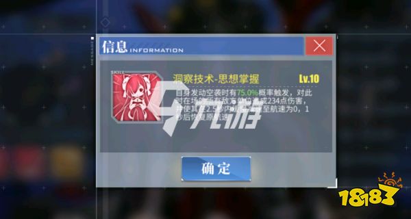 技能方面1技能“洞察技术-思想掌握”,空袭时75%概率触发对场上所有敌人造成234点伤害,并使其在2.5秒内缓慢减速至0,1秒后后恢复原航速。该技能的减速效果相较于可畏、彼得史特拉塞的时停,在效果的稳定性上更好,但技能概率却不稳定。特殊破甲算是变相的输出辅助,但不是重点。