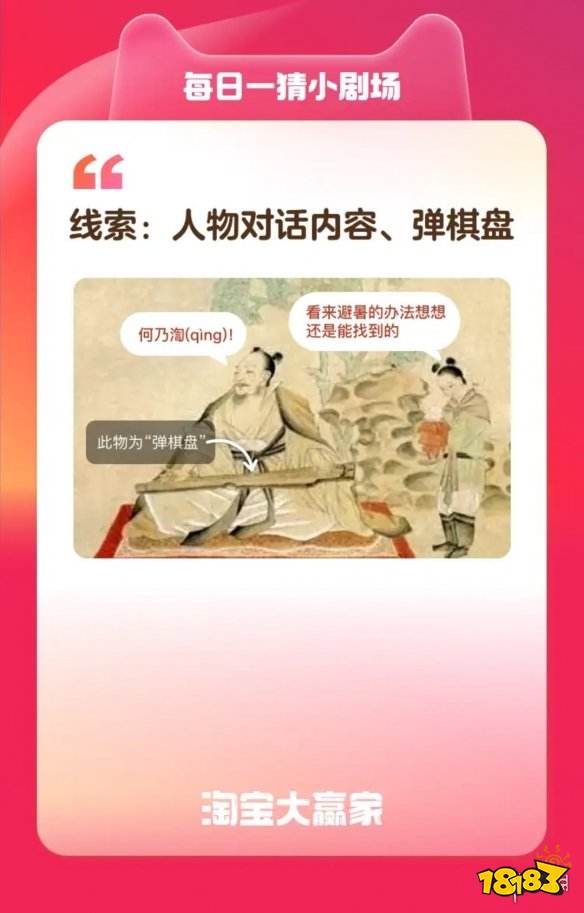 今天的题目是由每日一猜自己提供的,通过每日一猜“进来找线索”进入每日一猜小剧场后,我们可以发现一张线索图,线索是“人物对话内容、弹棋盘”。