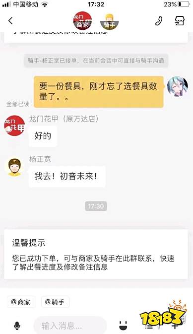 我去初音未来梗的来源就是下图中商家、骑手和客户的沟通聊天记录。