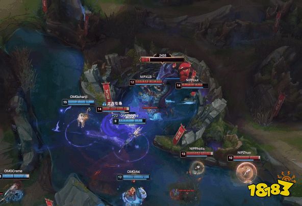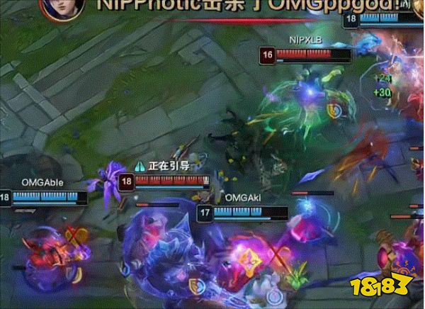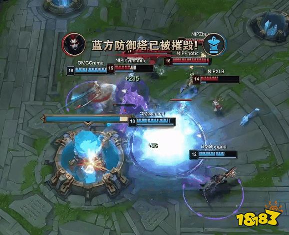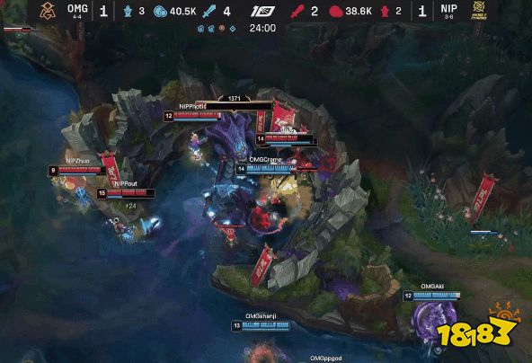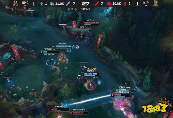 【18:22】OMG去开小龙,NIP四人包夹,猴子吃掉小龙后开R进场击飞四人,厄斐琉斯收掉蔚后再杀璐璐拿到双杀,泽丽下路送塔,OMG打出0换3拆掉NIP中路一塔,经济领先2K。