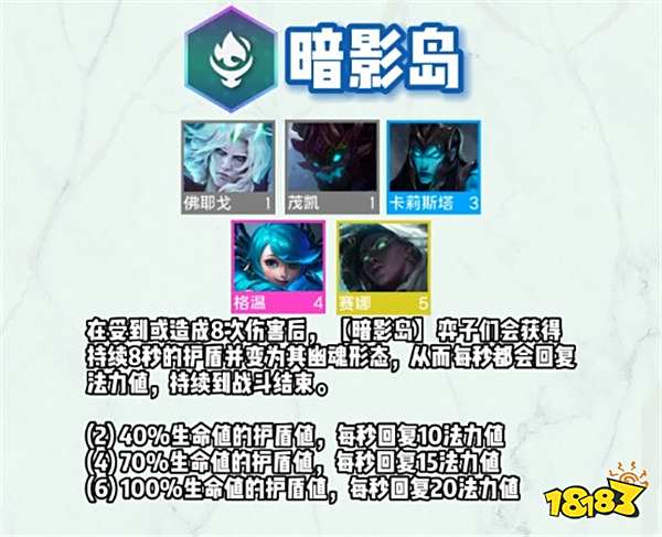 云顶之弈s9暗影岛羁绊应该是怎么样的呢?暗影岛是s9新赛季的一个羁绊,对局中棋子在受到8次攻击之后,可以获得8秒的护盾并化为幽魂状态,每一秒都可以恢复法力值,接下来就给大家带来详细的说明!
