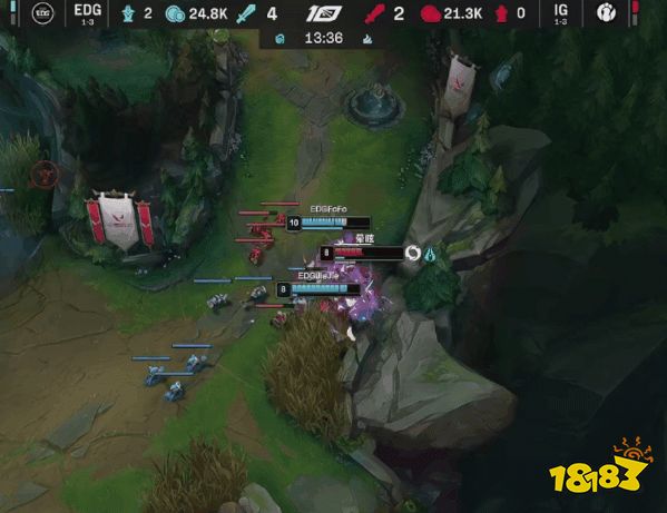 【12:13】iG下路回撤,EDG三人拔掉iG下路二塔,经济领先4K。