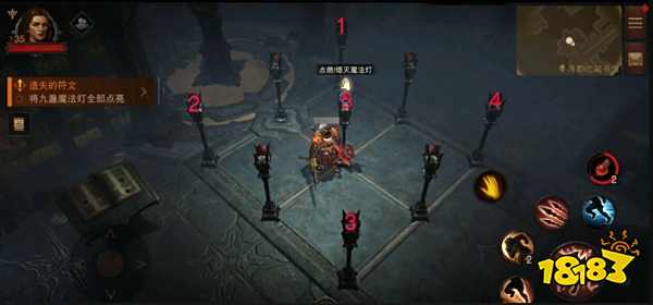暗黑破坏神不朽9个魔法灯点亮攻略:这个九个魔法灯需要先将四个对角的魔法灯点亮;然后点亮最中间的魔法灯,最后点亮剩余对角的魔法灯。