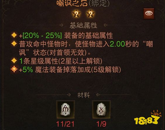 暗黑破坏神不朽嘲讽之石效果介绍:普攻命中怪物时,使怪物进入2.00秒的“嘲讽”状态(对首领无效),受到此效果影响的敌人对你的伤害减少 1%(6级解锁)。