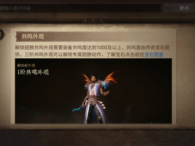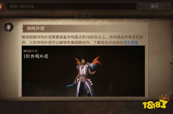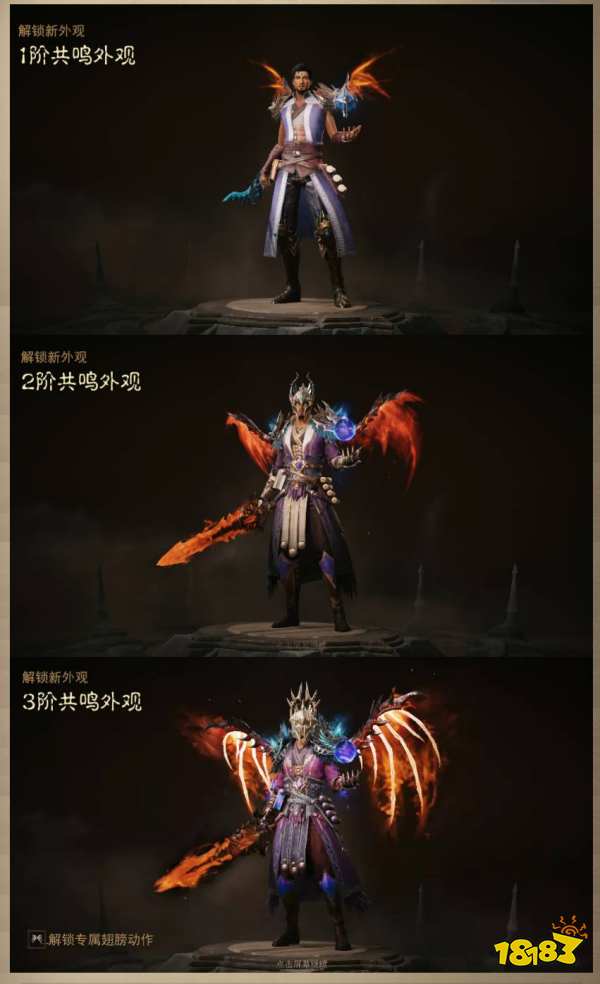 暗黑破坏神不朽翅膀需要玩家的共鸣度达到一定的程度以上才可以显现;一阶翅膀需要达到1000的宝石共鸣度,二阶翅膀需要达到3000的共鸣度;最后5000共鸣度可以达到三阶翅膀的外观。
