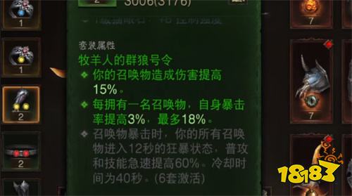 6件套:召唤物暴击时,你的所有召唤物进入12秒的狂暴状态,普攻和技能急速提高60%,冷却时间为40秒。