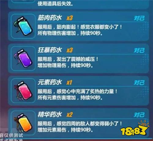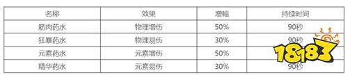 首先是新增了4类新型药水:筋肉药水、狂暴药水、元素药水和精华药水。相关数据如表所示: