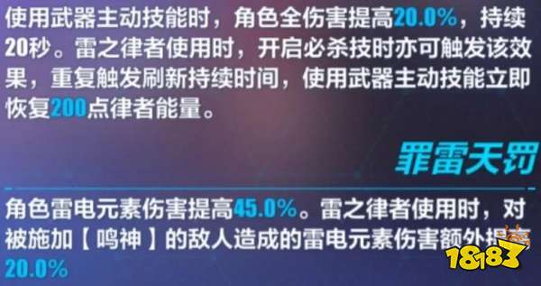 附加的【鸣神】则可以触发雷律的40%专属易伤,被动技能额外的20%雷伤20%全伤,确保武器主动全程都处于超高加成之下。此外,由于雷律回复律者能量需要对【鸣神】状态的敌人进行攻击。如果使用重磁暴,就必须先打一套普攻施加【鸣神】后,后续的普攻才能回复律者能量。而使用天殛之境:裁决(天殛之钥)的话,直接使用主动技能就可以了。