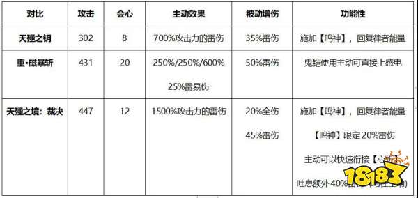 P.S. 天殛之境:裁决是一次性回复200点律者能量,而天殛之钥则是一次性回复100点律者能量,在随后2秒内回复100点律者能量。虽然两者实际上回复的律者能量总量一致,但天殛之钥不能一次性回满能量,也没有快速衔接心斩取消后摇的技能,手感会略差一点点。