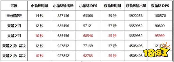 所以在和天殛之钥进行对比的时候,虽然重磁暴的输出量远远高于天殛之钥,但如果看DPS的话,两者是差不多的。甚至在小循环里,天殛之钥的DPS更高。