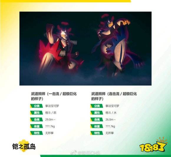 在《宝可梦:剑/盾》第一弹DLC铠之孤岛中,武道熊师(一击流)和武道熊师(连击流)都可以进行超极巨化,下边就给大家带来宝可梦剑盾武道熊师超极巨化的样子,大家可以来看一看。