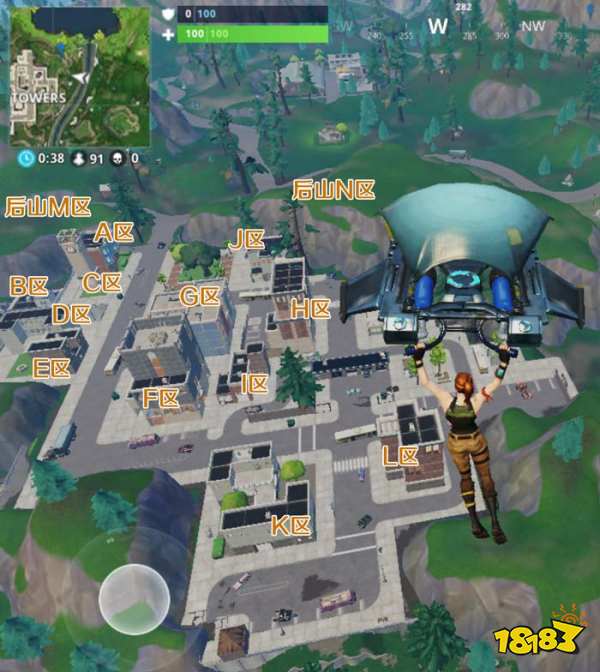 除了C区之外,还可以到后山M区,去利用建筑材料搭建一个堡垒,建好之后重点观察D、E、F、G、H区,因为D、E区靠近后山 ,离ABC区很近,敌人摸过来很容易。而G、H、I区一般跳伞人数很多,而且这三个地区因为地处中心,很容易被观察,射击距离也能够达到射程之内。也可以从A区外围绕到后山N区,也是一个观察蹲点的好地方。