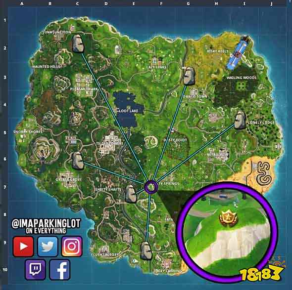 根据翻译,我们找到了堡垒之夜全地图共7处有人面巨石的位置,然后根据石头的面向衍生出蓝线,最终7处的蓝线交汇,由此青林判断,蓝线交汇处,就是星星所在的大概位置。