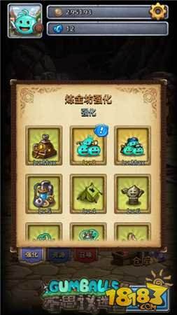 矿洞里冒着烟、有金色流质缓慢下流的便是“炼金坊”了。炼金坊里包含着各个强化项,可以对炼金坊以及游戏中的其它功能进行增强。如招募冈布奥工匠、招募斥候、冷却装置、野外生存工具、大工匠雕像、灵魂链接强化、资源强化等,甚至是召唤及强化冈布奥。