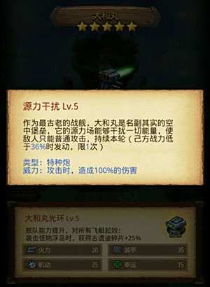 介绍:作为最古老的战舰,大和丸是名副其实的空中堡垒,它的源力场能够干扰一切能量,使敌人只能普通攻击,持续本轮(己方战力低于36%时发动,限1次)