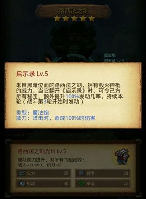 介绍:来自黑暗位面的路西法之剑,拥有毁灭神祇的威力。当它翻开《启示录》时,可令己方所有秘宝,额外提升100%发动几率,持续本轮(战斗第3轮开始时发动)