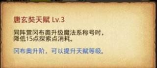 唐玄奘天赋 :同阵营冈布奥升级魔法系称号时,降低15点探索点消耗。