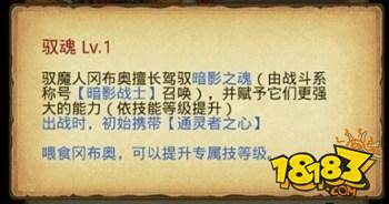 驭魔人技能:【驭魂】驭魔人冈布奥擅长驾驭暗影之魂(由战斗系称号【暗影战士】召唤),并赋予它们更强大的能力(依技能等级提升)。出战时,初始携带【通灵者之心】