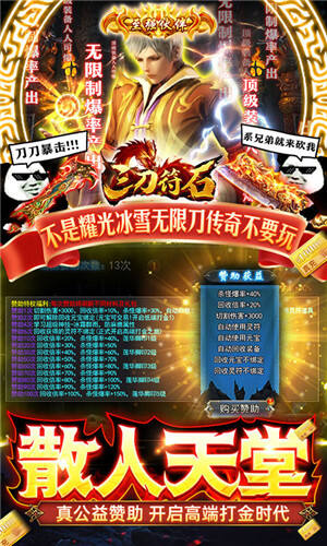 《三刀符石(耀光冰雪无限刀)》拥有无限制等级,无限制攻速,无限制装备,无限制技能 ,无限制爆率产出,完美继承复古经典传奇玩法,上千件装备,无限爆率,人人都可获得顶级装备,人人都可自由发展无限制淦服!传奇不死,情义不散!是兄弟就一起来《三刀符石(耀光冰雪无限刀)》,尽情挥洒基情岁月 !